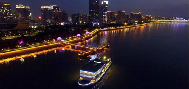 钱塘江夜游船时间是19:00,需要提前半个小时取票登船,每天就一班。夜游时间全程大约80-90分钟。沿途可以看到钱江世纪城、奥体中心、莲花碗,再到对面的城市阳台、大金球、大剧院、钱江新城。然后开往上游,过复兴大桥,到钱塘江大桥折回,来回大约10公里,饱览钱塘江两岸最精华的美景。