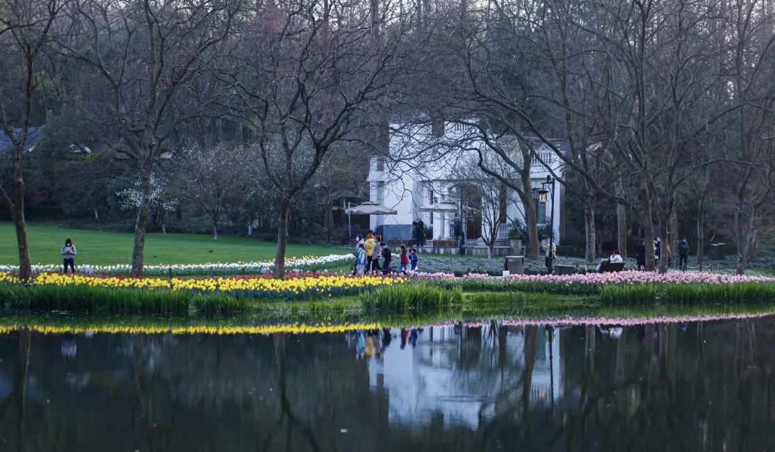 2、站着拍,也能出大片,郁金香和樱花同时兼得,以山、树、房子或桥为背景,拍出来照片美美的。