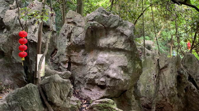 现有的龙泓洞,洞中端坐一尊观世音造像;洞的左面是射旭洞,透过岩顶的石缝能看到一线天光,这就是著名的一线天;在藏六洞可闻淙淙不绝的水声。