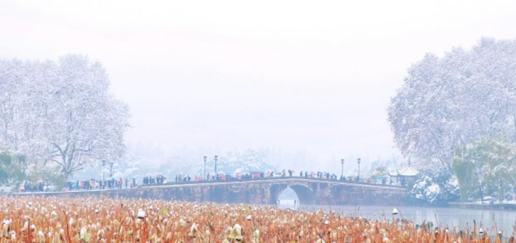 冬雪初下,桥的阳面冰雪消融,但阴面仍被残雪覆盖,从高处看桥似断非断,形成著名的“断桥残雪”。