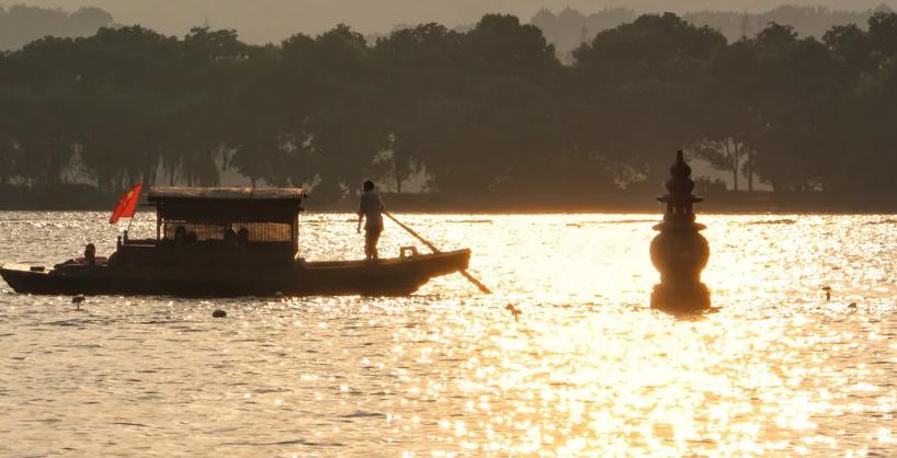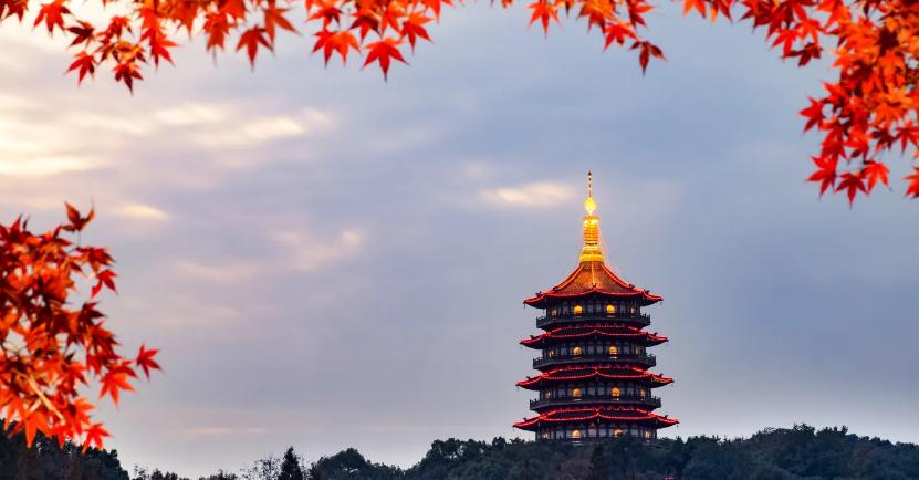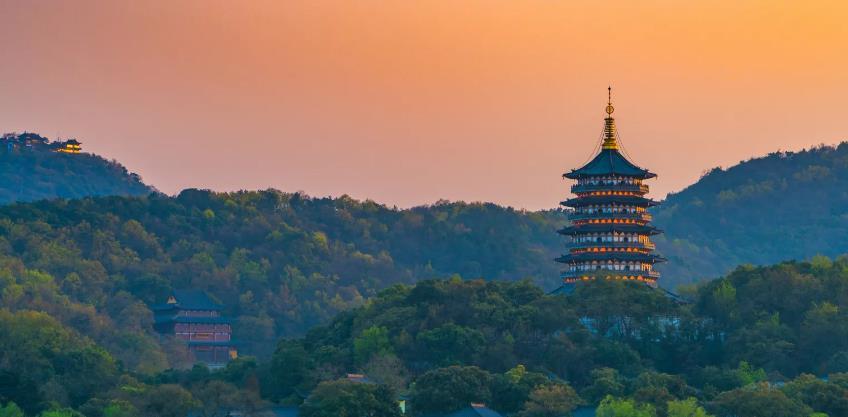 雷峰夕照,位于浙江省杭州市西湖湖南、净慈寺前的夕照山上,西湖十景之七,因晚霞镀塔,佛光普照而闻名。雷峰塔建于五代(975),是吴越国王钱弘俶为庆祝黄妃得子而建,初名黄妃塔。
