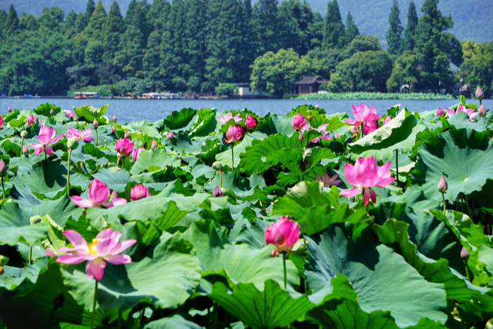 在西湖景区,曲院风荷的荷花是最为著名的。曲院风荷位于西湖西侧,是西湖十景中唯一以荷命名的景点,也就理所当然的成为了西湖夏季观荷的最佳去处。当花盛开的季节来到,这里是一个美丽的天堂,风荷景区以水面为主,分布着红莲、白莲、重台莲、洒金莲、并蒂莲等多种荷花品种,水面上还有造型各异的小桥,游客可以在小桥上穿行,漫步于荷花的世界。