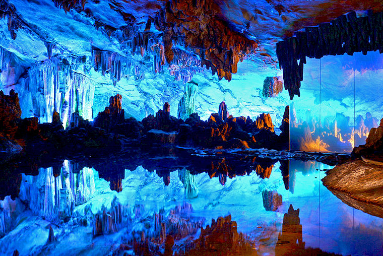 桂林芦笛岩景区是一个囊状的岩洞, 进口与出口相邻, 进洞处为原来的天然洞口,出洞处是开凿的人工洞口。洞深240米, 游程约500米。岩洞是70余万年前, 地下水沿着岩石的破碎带流动溶蚀而形成的。