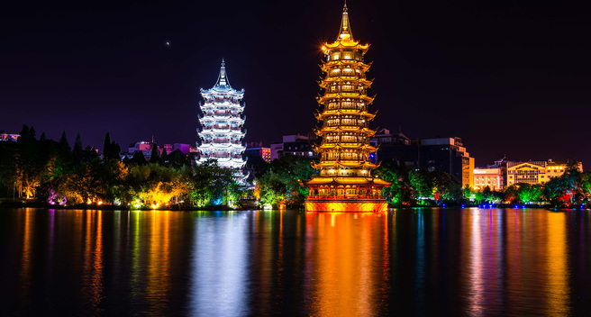 白每到夜晚,两座塔在灯光映衬下分别散发着金银两色光芒,倒影在湖中的景象格外漂亮。桂林日月双塔号称世界第一铜塔,是桂林旅游的一个绝美夜景观赏地。