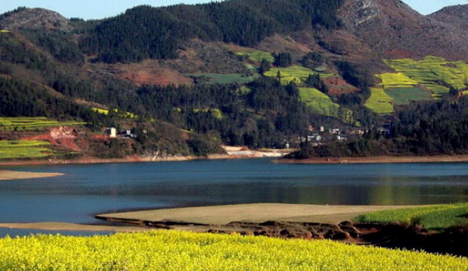 湾子湖别称湾子水库或湾子湖水库,犹如明珠一样镶嵌在大山深处,湖水碧蓝如宝石,四面的山峦上错落着油菜花田,伴着渔舟,伴着炊烟袅袅,恍惚间像是到了陶渊明笔下与世隔绝的桃花源。
