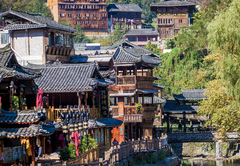千户苗寨千户苗寨境内河流长度为16.8公里,流域面积为65.39平方公里,平均比降45.7%,最大洪水流量455立方米/秒,最枯流量0.25立方米/秒,年平均流量为1.84立方米/秒。探明的矿点:开觉和白水河硅矿各1个,主要含砷、铅、锌等。开觉矿点可供开采50年以上。其他自然资源有森林资源和水资源等,境内森林覆盖率85.15%,有植物杉树、松树、枫香树、板栗树、青杠树、樟树、茶子树、映山红等居多。桂皮、木姜、杞木、杜仲、五倍子等几百种树种和药材、果树、茶树等。