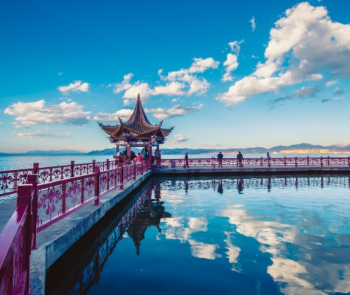 在风平浪静的日子里泛舟洱海,那干净透明的海面宛如碧澄澄的蓝天,给人以宁静而悠远的感受,让人领略那“船在碧波漂,人在画中游”的诗画一般的意境。湖内有“三岛”、“四洲”、“五湖”、“九曲”之胜。