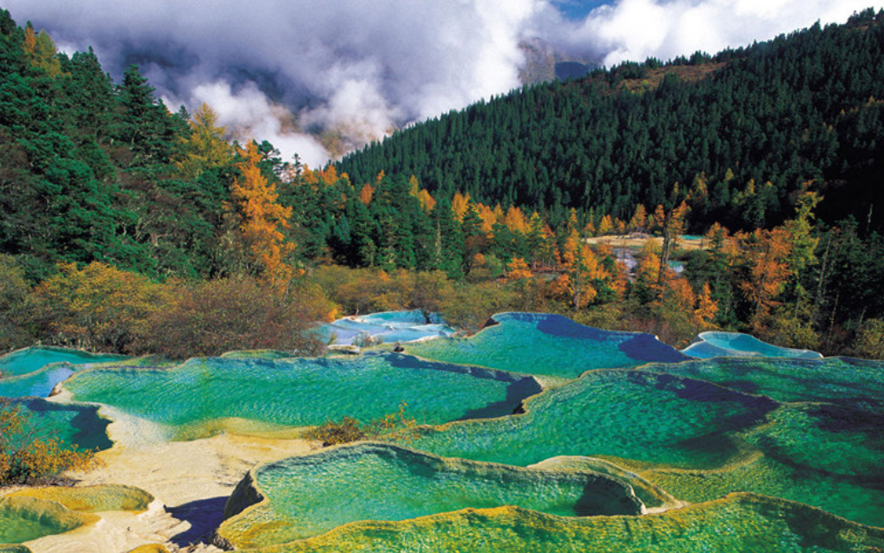 九寨沟蓝天、白云、雪山、森林、尽融于瀑、河、滩、缀成一串串宛若从天而降的珍珠;篝火、烤羊、锅庄和古老而美丽的传说,展现出藏羌人热情强悍的民族风情。九寨沟,一个五彩斑斓、绚丽奇绝的瑶池玉盆,一个原始古朴、神奇梦幻的人间仙境,一个不见纤尘、自然纯净的“童话世界”!她以神妙奇幻的翠海、飞瀑、彩林、雪峰等无法尽览的自然与人文景观,成为全国唯一拥有“世界自然遗产”和“世界生物圈保护区”两顶桂冠的圣地。 九寨沟以原始的生态环境,一尘不染的清新空气和雪山、森林、湖泊组合成神妙、奇幻、幽美的自然风光,显现“自然的美,美的自然”,被誉为“童话世界九寨沟”的高峰、彩林、翠海、叠瀑和藏情被称为“五绝”。因其独有的原始景观,丰富的动植物资源被誉为“人间仙境”。