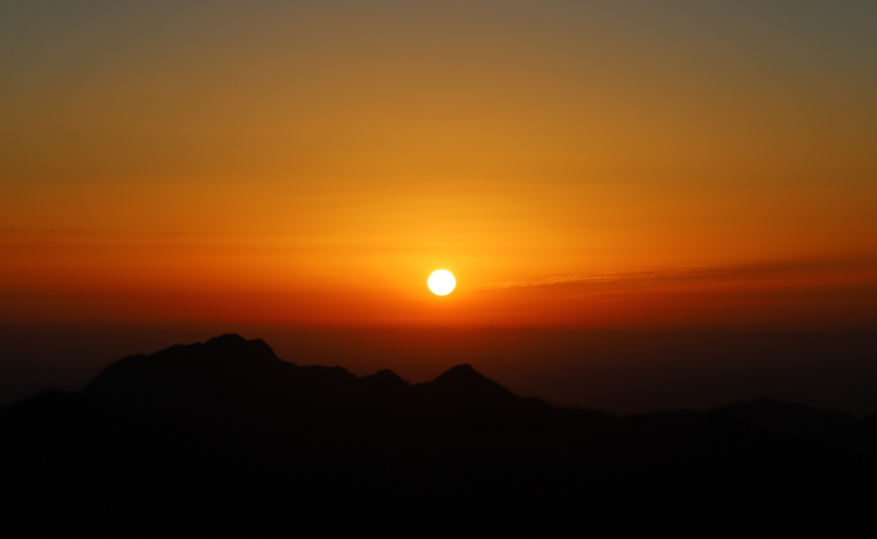 西岭的日出,因气象条件和季节的不同而千姿百态。天气晴朗时,太阳从地平线升起,可观赏到壮丽日出的全过程,壮丽的日出全过程就可以尽收眼底;或天边有云气,待见日出时,已是脱离地平线的一轮红日;或云层弥漫,则能看到朝霞与云海,雪白的绒毯一般平展铺在地平线上,光洁厚润,无边无涯。