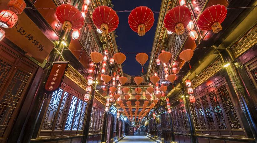 锦里古街与武侯祠一墙之隔,游客一般会在游玩武侯祠后,来此逛一逛,这里洋溢着成都特有的喧嚣和随意。古街里青瓦错落有致,青石板路蜿蜒前行,街道两旁店铺里摆着许多颇具当地特色的物品,如手工的皮包、五颜六色的布灯笼等,还有众多老成都手艺人制作吹糖画、捏面人。此外,这里各色美食也会令你垂涎三尺,有张飞牛肉、豆花、牛肉焦饼、钵钵鸡等,各具风味。