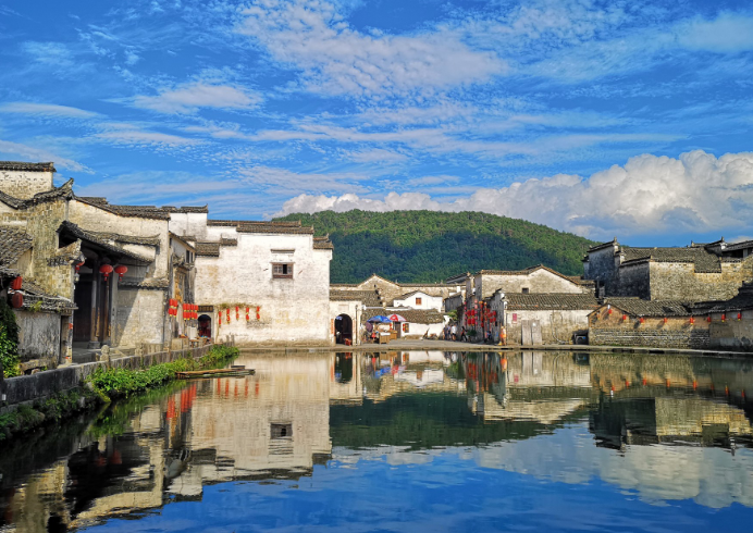 三、月沼湖月沼湖位于宏村村落中央,即牛胃处,状如半月,老百姓俗称其为月塘。这里常年碧绿,塘面水平如镜,塘沼四周青石铺展,粉墙青瓦整齐有序分列四旁。不少经典大片都出自于此;当夜色朦胧时,月沼边一排灯笼亮起,非常有意境。