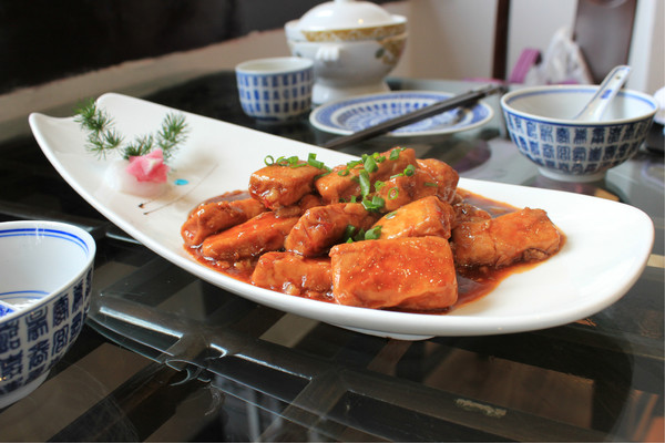4、臭鳜鱼臭鳜鱼,又称臭桂鱼,徽州臭鳜,腌鲜鳜鱼,因放入桶里腌存,也名桶鱼,是黄山传统的民间菜,流行于皖南一带,如屯溪、歙县、休宁、黟县、绩溪一带。