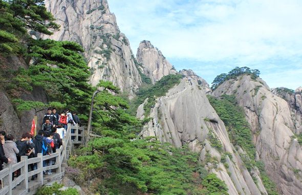黄山风景区奇松形态非常奇特,据说是以石为母,与峰石相连,妙不可言;主要代表有玉屏楼的迎客松和送客松、始信峰的龙爪松、鲫鱼背旁的探海松,以及与唐明皇杨贵妃有关传说的连理松等。