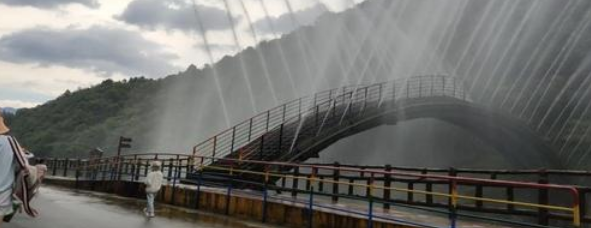 彩虹桥为钢结构弧形拱桥,形似彩虹。拱桥两侧设有通水管道,共安装喷嘴60只,水源由2600米钢管自英山湖引至,喷水下落经阳光照射从不同角度能观赏到数条精美的彩虹,特别是在桥顶能看见闭合的整圆形彩虹。