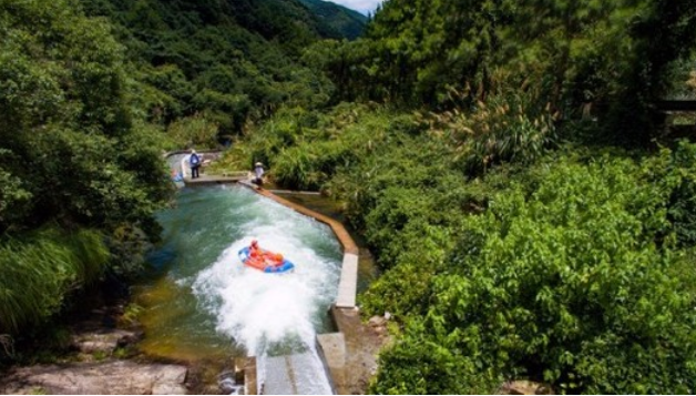 大水碓位于漂流起点附近,长度40米,采用杠杆原理,碓尾为水箱,游客可乘坐碓头,通过不断向水箱充水,当水箱水满时下落至底部,碓头即高举,碓头水泄后下落砸入水中,游客可体验瞬间落入水中的快感。
