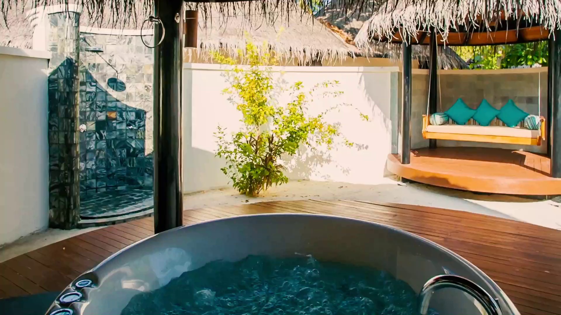 别墅位置很隐蔽,打开私人的封闭式庭院,套房的浴室很安静,可以舒服的洗个澡,也能够在甲板上一边观赏泻湖风光,一边享受日光浴。